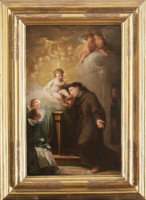 Siguiendo la iconografía tradicional, en la obra que presentamos Maella nos presenta a San Antonio arrodillado ante una mesa sobre la que se muestra el Niño Jesús sentado sobre un trono de nubes, en actitud de bendecir al Santo. El Santo portugués besa el pie izquierdo del Niño. En el suelo en un primer término, un libro abierto y unas azucenas, atributo de la castidad. En la parte superior del cuadro, la gloria angélica compuesta por querubines, destacando los dos ángeles volando de la parte izquierda, que contemplan la escena. Al fondo a la derecha, entre la arquitectura, un personaje observa el instante como testigo humano de la aparición milagrosa.