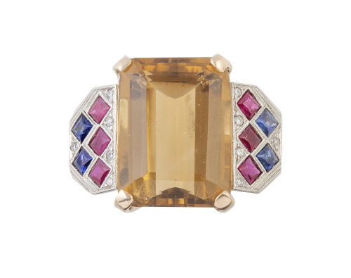 Sortija con cuarzo citrino central de talla esmeralda, con bandas en damero de rubíes y zafiros combinados con brillantes a ambos lados