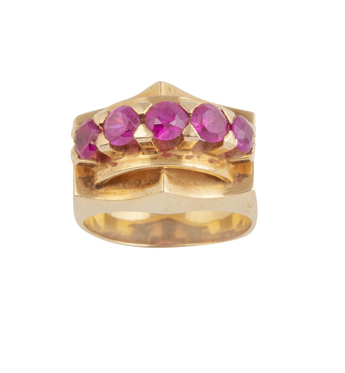 Sortija chevalièr francesa años 40 con arco elevado de rubíes sintéticos