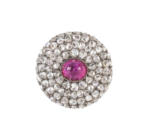 127. Broche colgante c. 1850 circular cuajado de diamantes, con cabuchón pan de azucar de rubí central