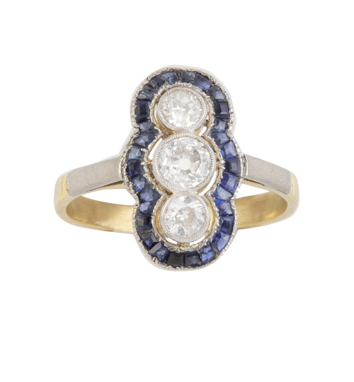 Sortija lanzadera Art-Decó con tres chatones de brillantes de talla antigua rodeados por marco lobulado de zafiros