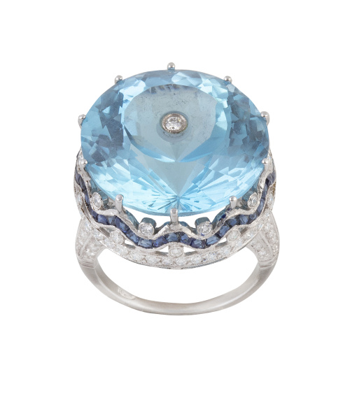 Sortija estilo Art-Decó con gran piedra azul central, en montura de brillantes y zafiros calibrados con diseño geométrico