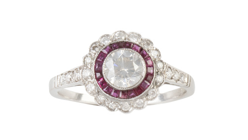 Sortija ojo de perdiz con brillante central, orla de rubíes y orla exterior lobulada de brillantes