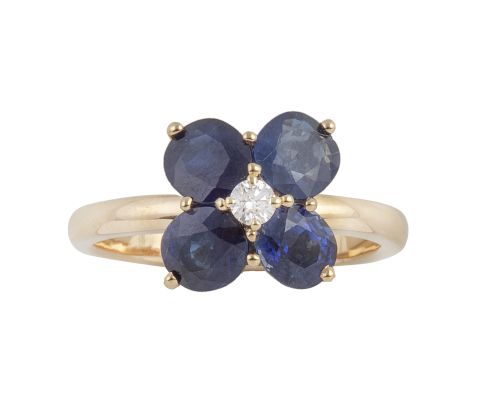 Sortija flor con cuatro zafiros de talla oval a modo de pétalos y brillante central