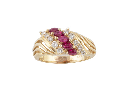 Sortija de rubíes y brillantes con banda oblícua de rubíes talla navette flanqueados por líneas de brillantes, en montura gallonada