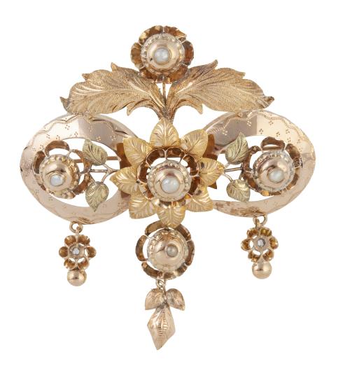 21. Broche de pp. S. XX con diseño floral decorado con flores, hojas grabadas y perlitas