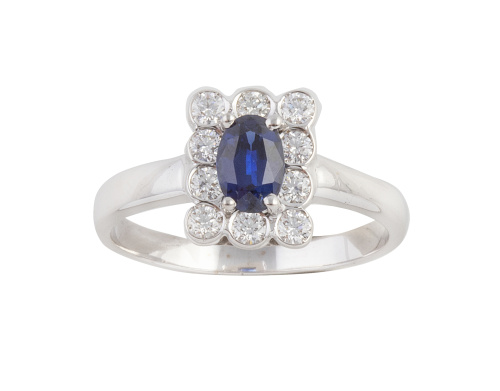 Sortija con zafiro oval central en marco exterior de chatones de brillantes