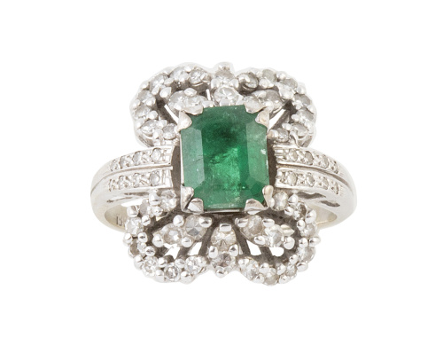 262. Sortija con esmeralda talla esmeralda con marco lobulado de brillantes a modo de flor