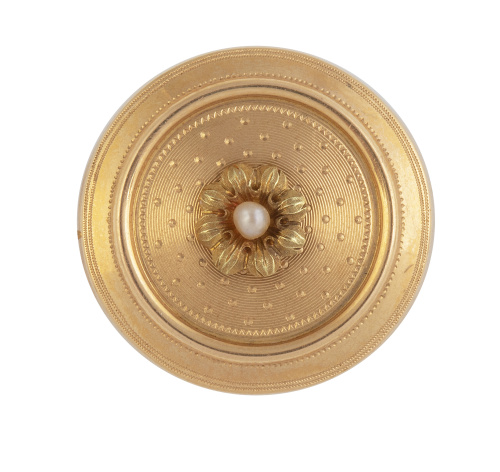 27. Broche circular francés S. XIX con flor central decorada con perla fina y fondo con delicada decoración guilloché