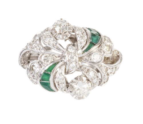 273. Sortija años 30 con brillantes y piedras verdes en diseño de lazada de varias cintas