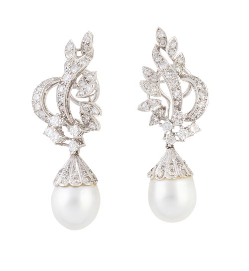 278. Pendientes largos de perlas australianas y brillantes, con pieza superior de cintas y hojas de brillantes, de la que pende perla australiana con capuchón de brillantes