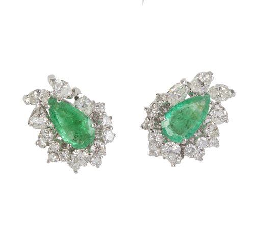 283. Pendientes de esmeraldas talla pera central orlados de brillantes y diamantes talla navette engastados a diferentes alturas