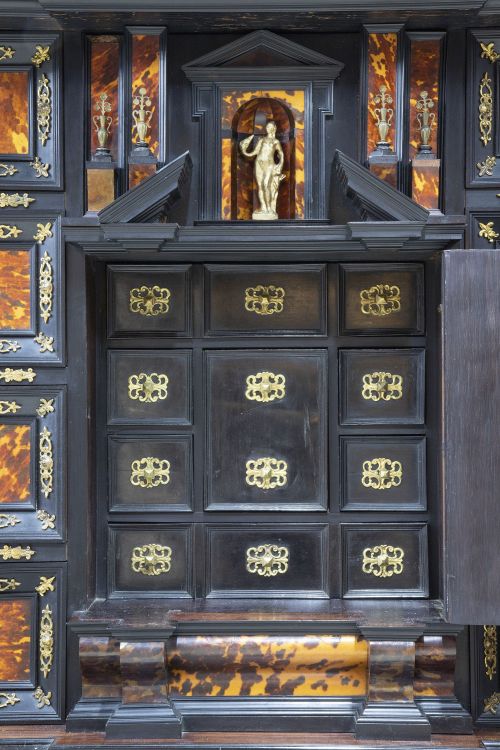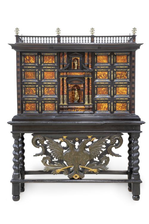 Papelera de frente arquitectónico en madera de palisandro, ébano, concha de tortuga, madera ebonizada y bronces aplicados y dorados, en su mesa original con águila bicéfala.