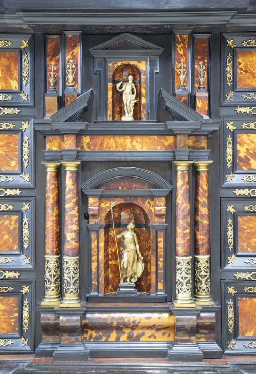 Cuatro cajones a cada lado, flanquean la puerta central del frontón partido y dobles columnas de orden dórico, con la figura de Palas Atenea en bulto redondo bajo un arco, en la parte superior de la puerta en inferior hay dos cajones, el inferior con ménsulas. La mesa con faldón con águila bicéfala y patas de torneado salomónico.
