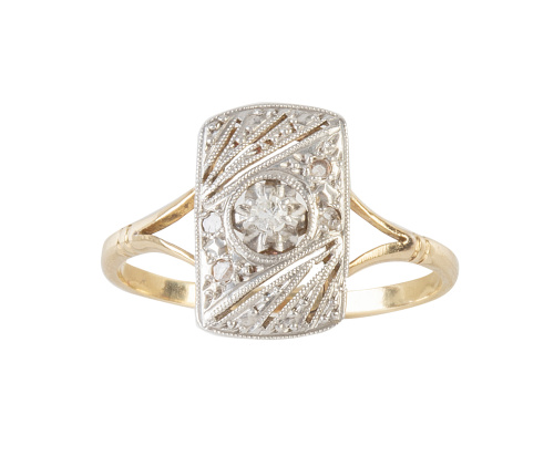 69. Sortija lanzadera Art-Decó rectangular con decoración calada y brillante central