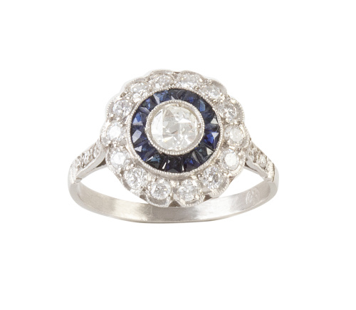 Sortija ojo de perdiz de zafiros y brillantes estilo Art-Decó, con brillante central orlado de zafiros calibrados, y orla exterior lobulada de brillantes