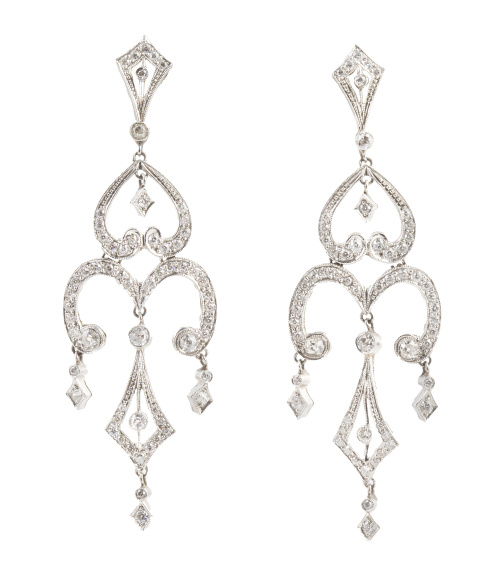 80. Pendientes largos chandelier estilo Belle-Époque de brillantes con motivos florales y de roléos con rombo colgante