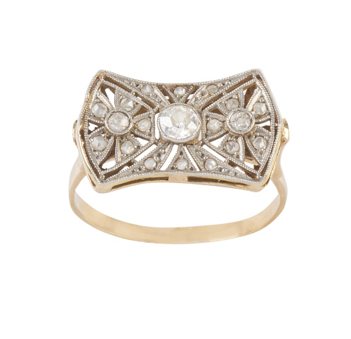 Sortija Art-Decó de diamantes en frente a modo de lazo, con chatón central y decoración calada decorda con diamantes