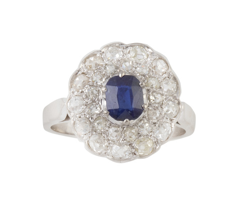 93. Sortija rosetón de brillantes con zafiro central de talla oval, con doble orla de brillantes, la exterior en marco lobulado