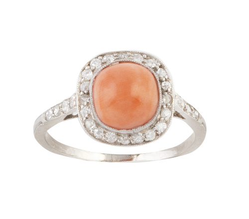 94. Sotija con coral en cabuchón elevado central, orlado de brillantes