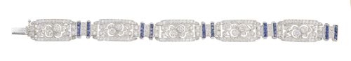 96. Brazalete de brillantes y zafiros estilo Art-Decó, con cinco motivos rectangulares de brillantes con dos chatones de brillantes a modo de flores centrales, articulados con bandas arqueadas de zafiros y brillantes