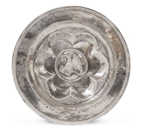 Plato circular con decoración polilobulada en el asiento con un águila y flores