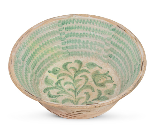 Lebrillo de cerámica esmaltada en blanco y verde.
