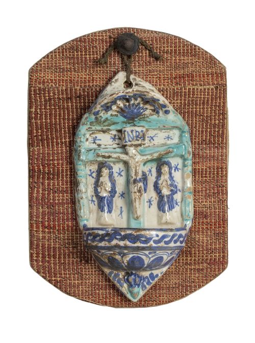 1273. Benditera de cerámica esmaltada en azul, verde y blanco con Cristo en la cruz.