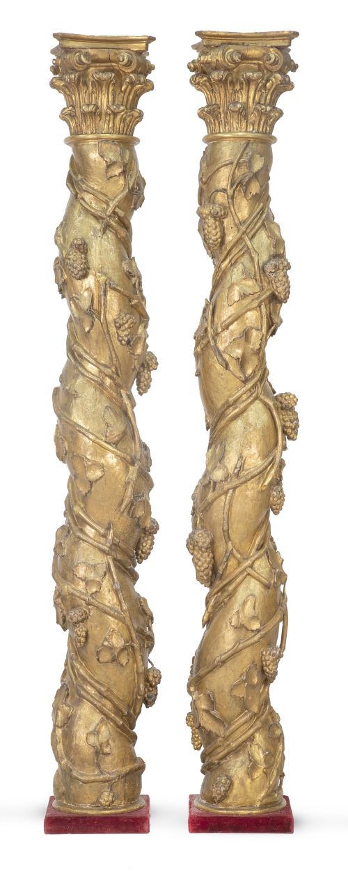 1289. Pareja de columnas salomónicas con capiteles de orden corintio en madera tallada y dorada.