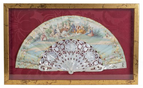 Abanico con país pintado con escena dieciochesca al aire libre y varillaje de nácar calado.