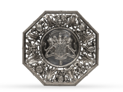 Home / SUBASTA DE JUNIO 2024 / Centro octogonal de plata con escudo nobiliario. Con marcas