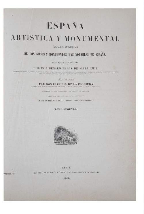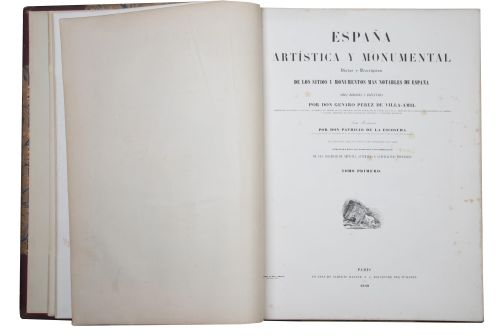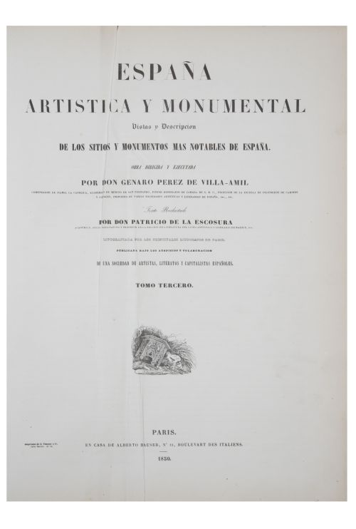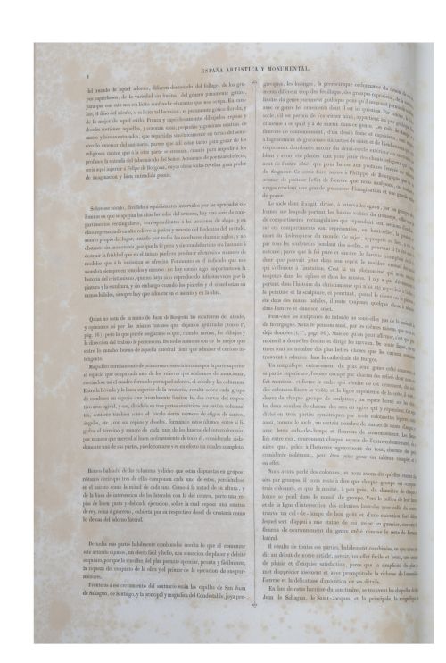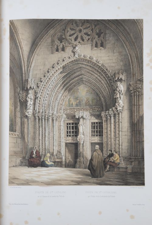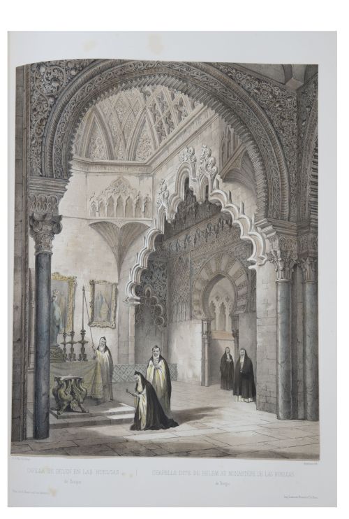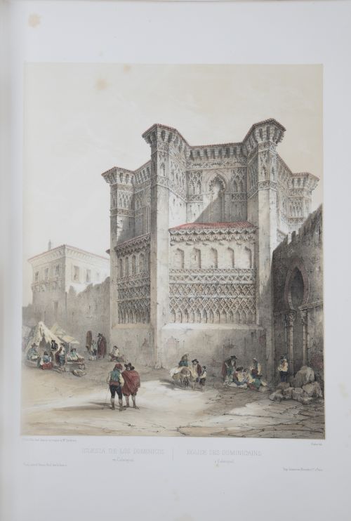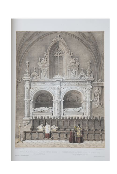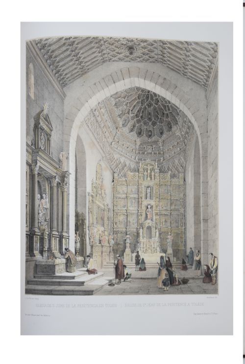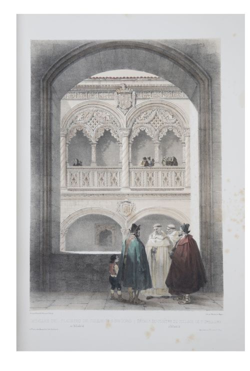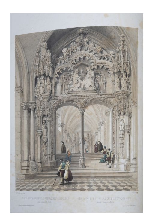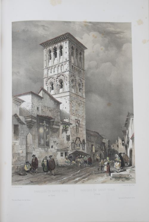 Con el aire romántico habitual en las obras europeas similares, Pérez Villaamil presenta la riqueza monumental de España aportando a los paisajes urbanos los toques costumbristas de la amplia variedad de tipos españoles del siglo XIX. Trabajaron en al estampación veintitrés litógrafos franceses y un español; a pesar de esa variedad de manos y las licencias interpretativas respecto a los originales, el conjunto resultó plenamente uniforme gracias a la buena dirección de Pérez Villaamil. Ref.: Palau: 222728.