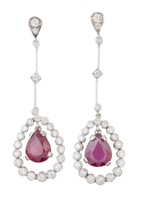 Pendientes largos estilo Belle Epoque de rubíes y brillantes