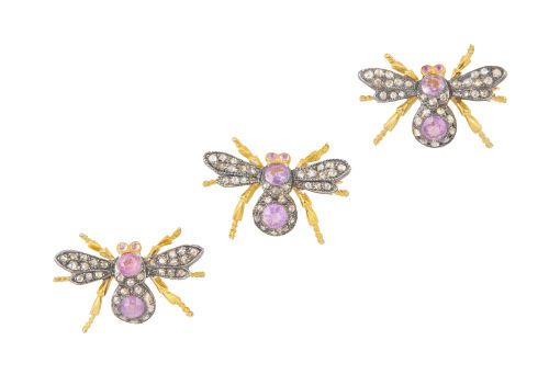 Home / SUBASTA DE OCTUBRE 2024 / Tres broches mosca con cuerpo de piedra rosa