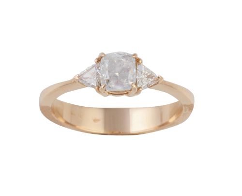 Sortija con brillante central talla cojín de 0,90 ct, color estimado light yellowish grey, flanqueado por dos diamantes de talla triangular