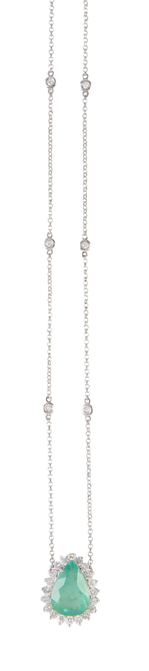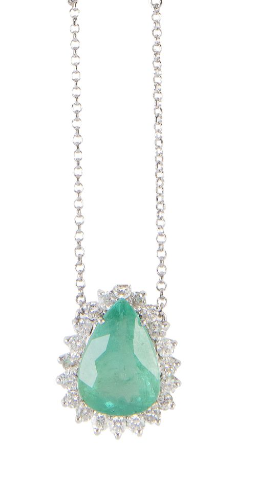 138. Pendentif con perilla de esmeralda orlada de brillantes, que pende de cadena fina combinada con chatones de brillantes