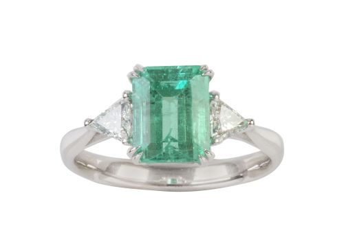 143. Sortija con esmeralda central de 2,39 ct talla esmeralda, flanqueada por diamantes de talla triangular