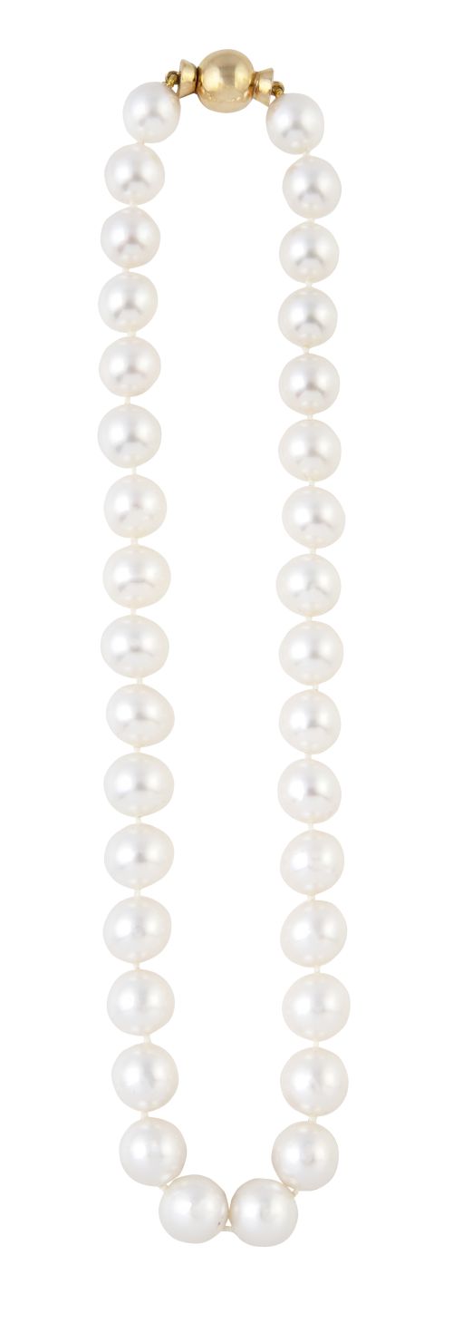 144. Collar de perlas australianas de intenso lustre, de tamaño ligeramente creciente hacia el centro, con cierre de esfera en oro liso