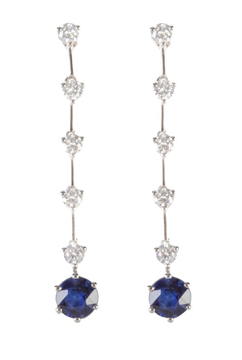 154. Pendientes largos con zafiros circular colgante de banda de brillantes engastados en garras y barritas lisas articulados