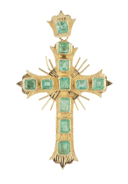 Cruz colgante de esmeraldas cuadrangulares sobre fondo de oro mate