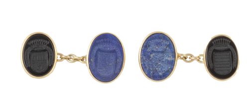 Gemelos dobles con intaglios de escudos en placas ovales de ónix y lapislázuli combinadas