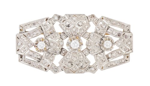 Broche placa años 30 de diamantes con tres brillantes centrales, en diseño simétrico
