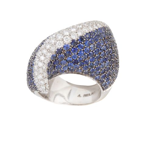 231. Sortija con diseño de ola, relizada con cuajado de zafiros en montura bombée, coronada con cresta de pavé de brillantes