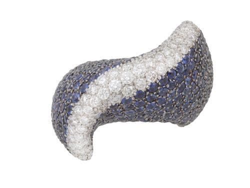 Sortija con diseño de ola, relizada con cuajado de zafiros en montura bombée, coronada con cresta de pavé de brillantes