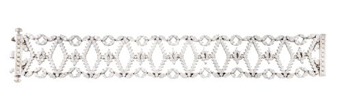 234. Brazalete ancho de brillantes con diseño calado de rombos entre bandas de círculos y hojitas de brillantes