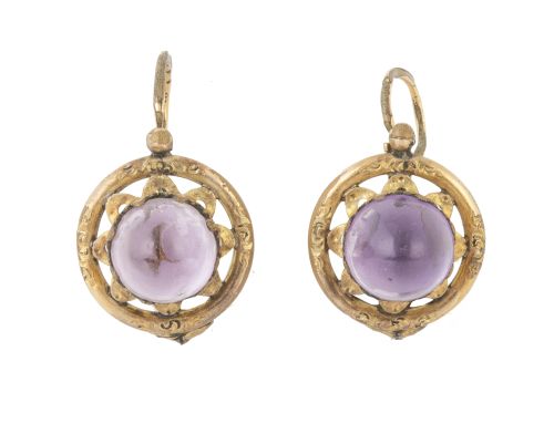 25. Pendientes Art-Nouveau con cabuchón pan de azucar de amatista en marco circular calado