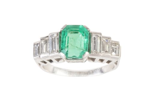 Sortija con esmeralda talla esmeralda de 2,5 ct aprox, flanqueada por tríos escalonados de diamantes talla baguette
