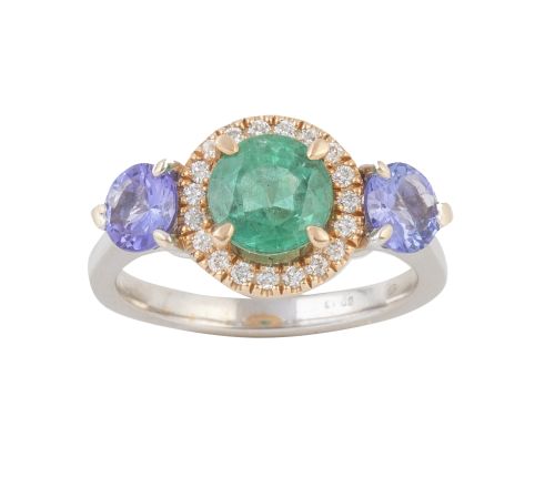 Sortija con esmeralda circular de 1,52 ct, orlada de brillantes, y flanqueada por tanzanita circular