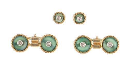 Con círculos de ágata verde decorados con marcos de oro grabado y diamantes centrales.