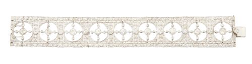 313. Elegante brazalete ancho de platino y brillantes Art-Decó con diseño de banda rectangular calada